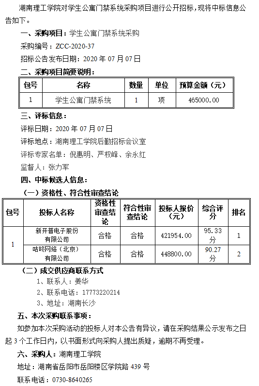 太阳集团tyc151学生公寓门禁系统中标信息公告