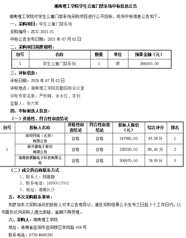 太阳集团tyc151学生公寓门禁系统中标信息公告